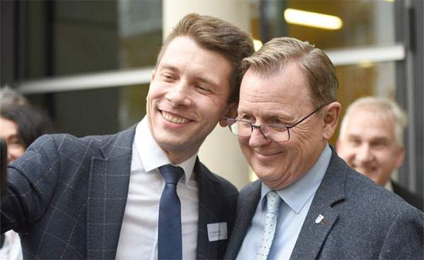 к.т.н. Денис Невінський разом з прем’єр-міністром Вільна земля Тюрингія Бодо Рамеловим на вітальній події FAV для іноземних учасників, Ерфурт, 24.11.2022.